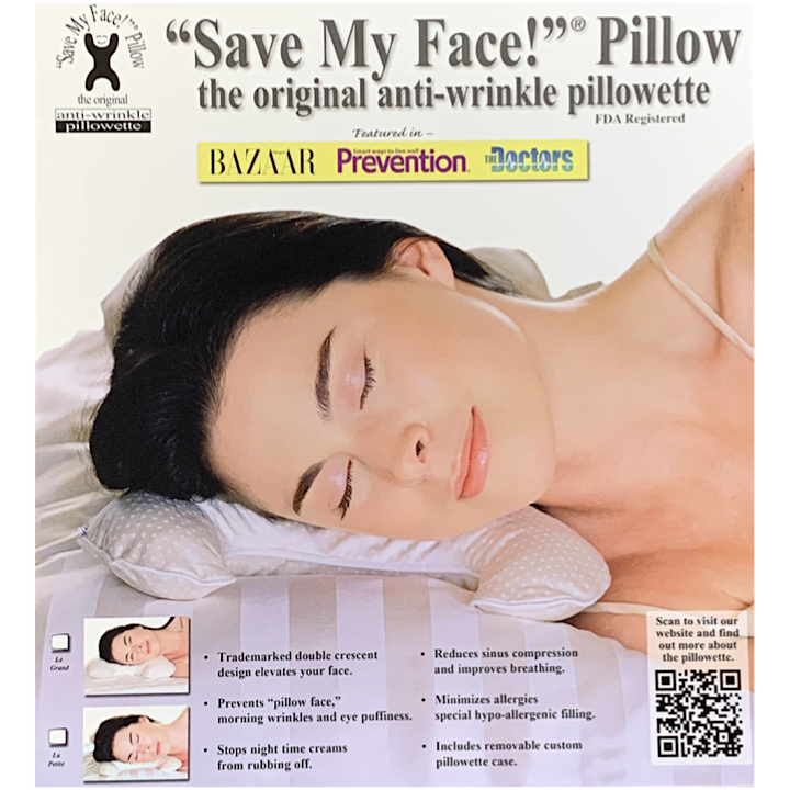 "Save My Face!"® Pillow gently ELEVATES and SUSPENDS your face over the sleep surface allowing you to rest comfortably, removing harmful pressure on facial tissues and muscles.
